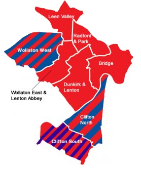 The Nottingham South constituency covers the wards of Bridge, Clifton North, Clifton South, Dunkirk and Lenton, Leen Valley, Radford and Park, Wollaton East and Lenton Abbey and Wollaton West.